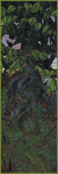 On one sliver of bark is this rumination: "Also known as Mother Nature, The Good Mother and The Bountiful Sister, Beade embodies the health and vitality of Thrael and the known universe. Views differ between races, and while most believe she is the intelligent force behind elemental nature and the defender of all things natural, sylvani belief is that Beade is the world in the most literal sense. The daun have marginalized this entity to represent a celestial caretaker of the world, but the elves are firmly convinced that she is an actual, living entity whose physical manifestation can be seen in every animal, mineral and vegetable."